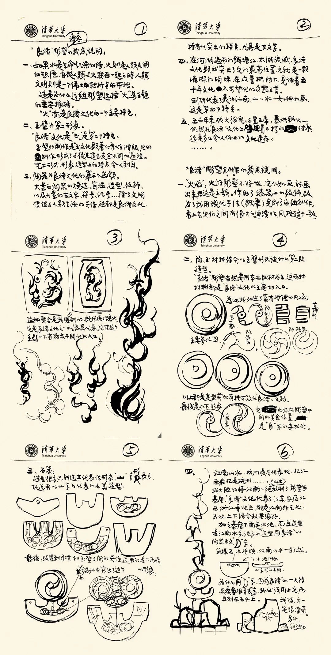 為了使雕塑設計兼具文化內涵和視覺審美,美林開始查閱大量的相關史料,複印了數百頁文物資料,繪製了無數質樸的線條和神秘的文字圖案。從具象的火焰、玉器圖案,到意象的江南山水,無論是火焰的奪目,還是玉璧的溫潤;無論是陶器的質樸,還是江南山水的典雅;無論是古代文字的厚重,還是良渚器物的豐富……每一個形象元素,在美林的創作中都顯得生動和傳神。