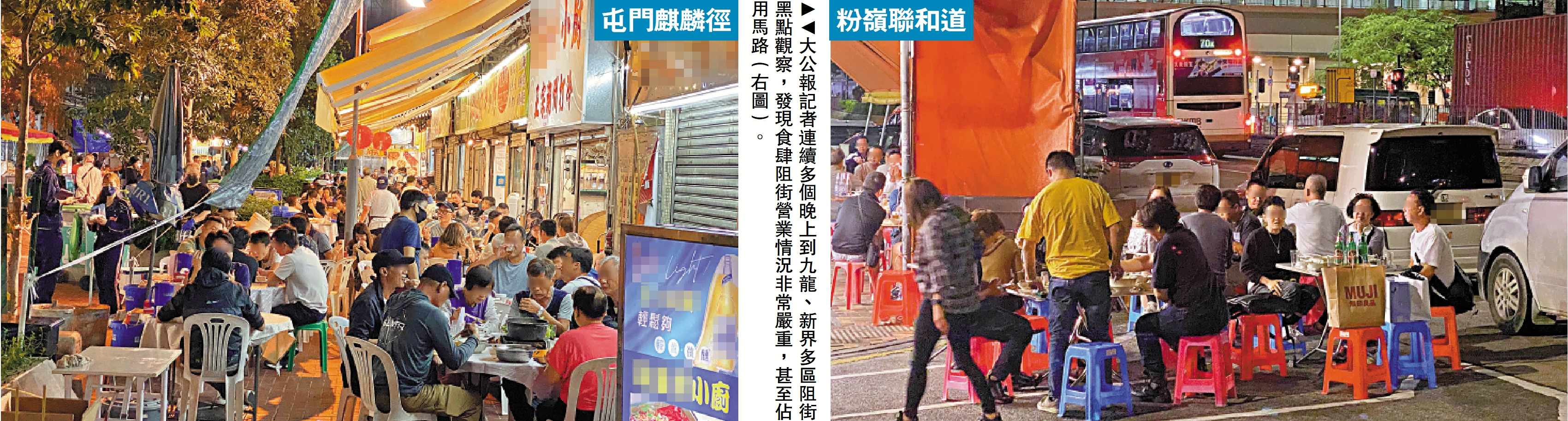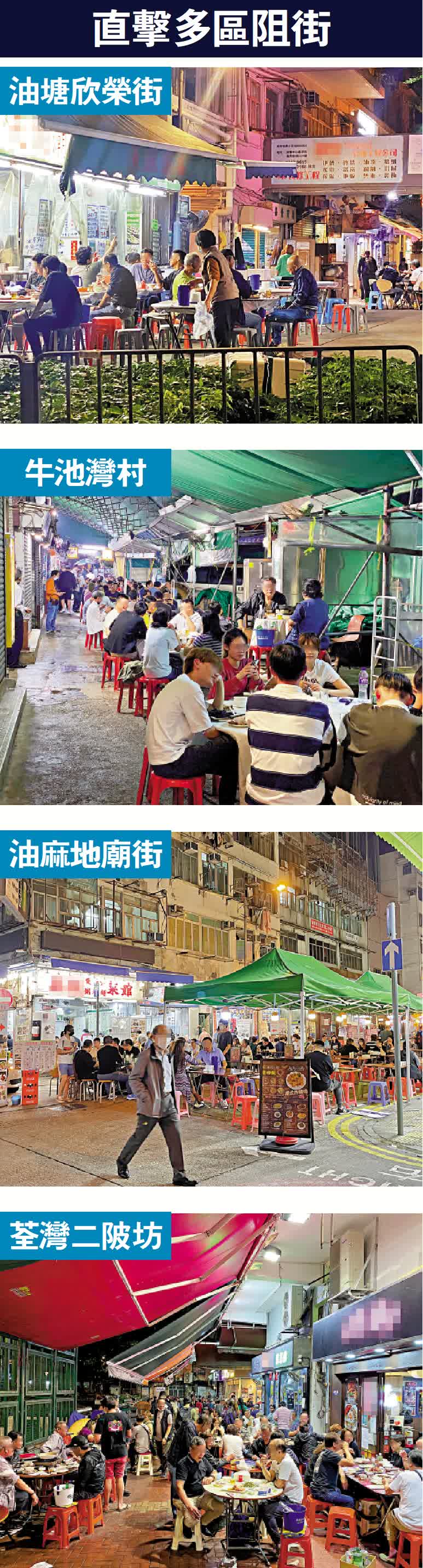 此外,記者日前分別在晚市及宵夜時段,到彩虹牛池灣村、石硤尾街醫局街、油麻地、塘尾道亞皆老街交界、油塘欣榮街、荃灣二陂坊等多個黑點觀察,發現食肆霸馬路營業非常普遍,行人路擺滿枱櫈,座無虛席。