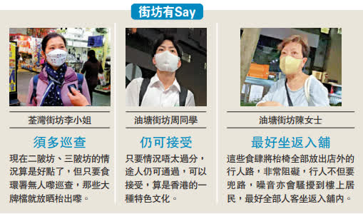 在石硤尾街,有食店枱櫈擺滿整條行人路,行人被迫側身而過或走出馬路,有食店的「用餐區」甚至霸出馬路,食客與汽車相鄰而坐。深水埗李鄭屋邨的東京街,有茶餐廳門外擺了八張枱,食客高談闊論,煙蒂丟滿一地。油麻地廟街近永星里附近,近百張枱擺滿了行人專用區,場面墟冚。