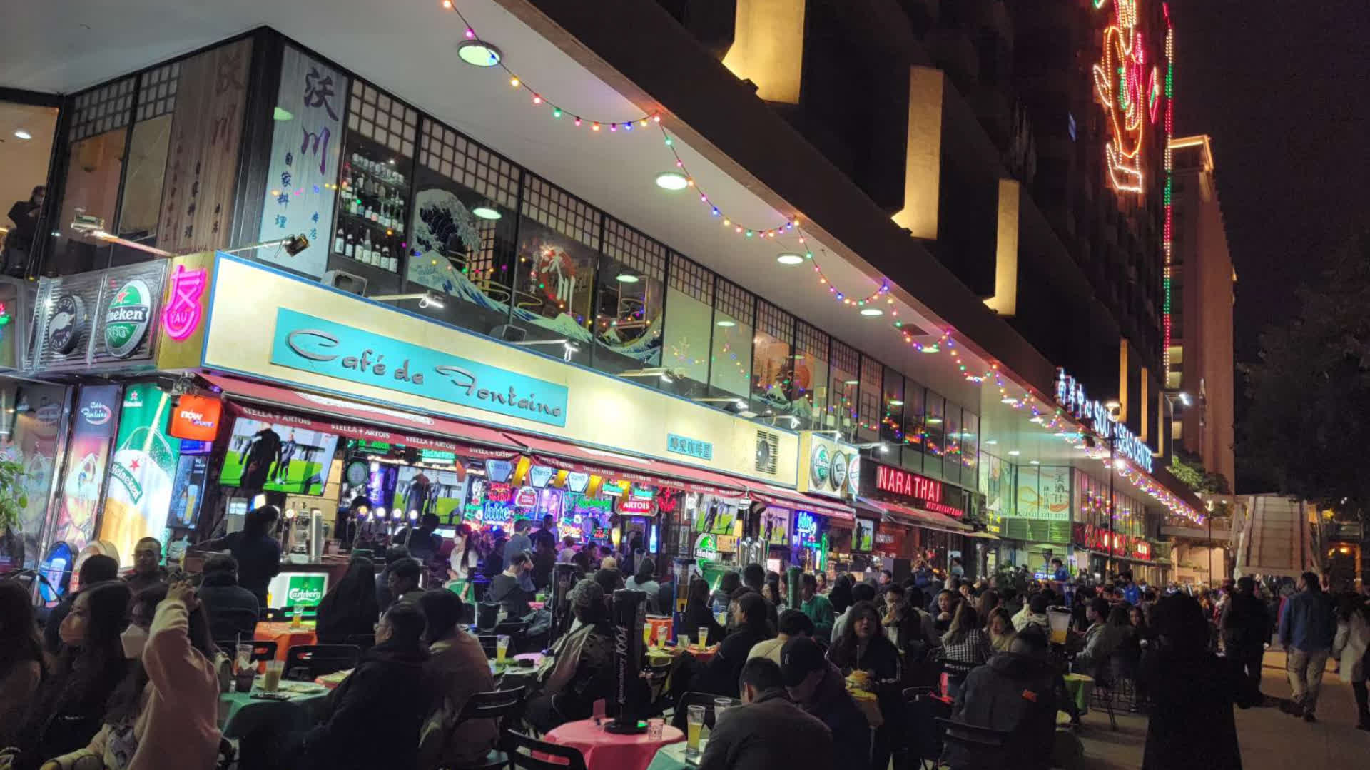 新界區的街頭晚宴更誇張。在將軍澳坑口村口,有食店直接在行人路設置了整排帳篷,擺滿30多張枱,食客喝酒喧嘩,旁若無人。