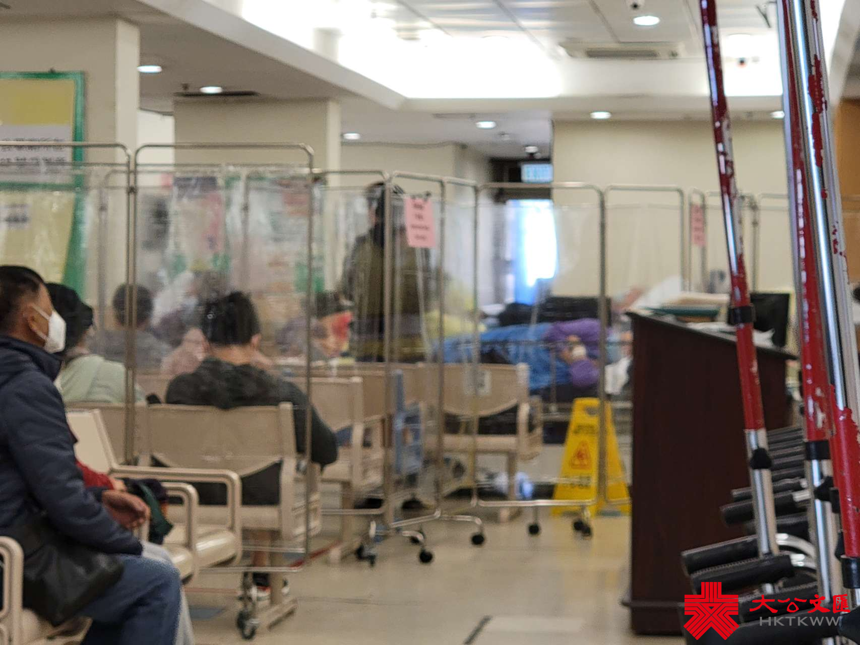 其後記者到達位於新界的屯門醫院急症室,雖然醫院急症室等候人數不多,急症室分流區則以透明屏風劃分兩個區域,記者向工作人員了解情況,工作人員指,現場檢測確診新冠病人會先安排透明屏風另一邊等待。就記者所見,現場最少有20名的病人臥床,其他等候急症服務的病人則與確診新冠病人只有一屏相隔。