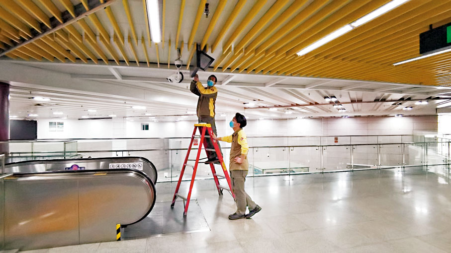 香港文匯報記者來到深圳地鐵4號線福田口岸站,站廳內客流較少,1樓進站大廳車站工作人員正加緊檢修燈泡、空調、車站指示牌等設施。車站內A、B出口處各有兩部扶手電梯可直通2樓,與福田口岸出入境旅檢大廳相連,但因疫情暫時被圍擋隔開,待通關之日才會恢復使用。