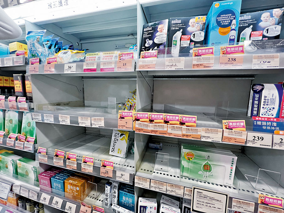 (香港文匯報 記者 廣濟、張弦)香港搶藥潮愈演愈烈。香港文匯報記者昨日巡查十多間藥房,發現除了止痛藥,連川貝枇杷膏、潤喉藥品也被搶購一空。止痛退燒藥更被炒至「癲價」,一款熱門牌子的止痛退燒藥,要麼是缺貨,要麼是被炒高逾3倍,甚至有藥房以止牙痛藥充當止痛退燒藥售賣。藥房開天殺價,基層市民硬啃苦果。一名市民表示,走遍住所附近幾條街的藥房都空手而回, 「原本四五十蚊一盒的藥炒到幾百蚊,點買?」他透露家中的成藥已吃光,擔心一旦染疫或不適又無法外出,便無藥可應急。