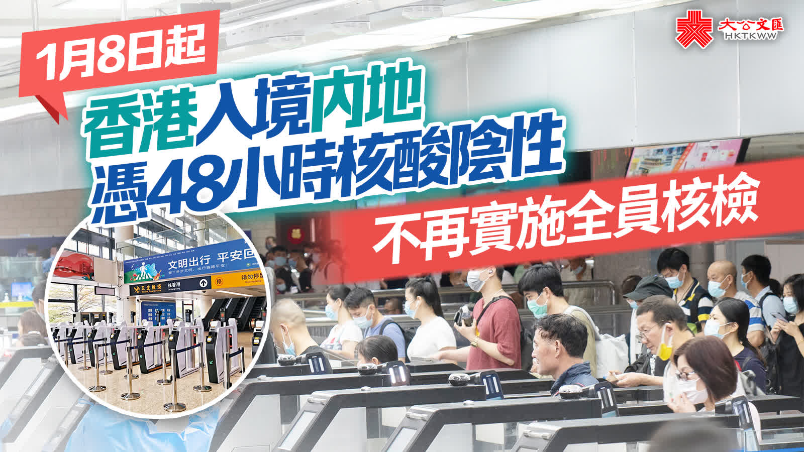 大公文匯網報道,國務院聯防聯控機制綜合組今日(5日)發布《關於優化內地與港澳人員往來措施的通知》。《通知》指出,優化內地與港澳人員往來措施,自2023年1月8日起實施,自香港入境人員憑行前48小時新冠病毒感染核酸檢測陰性結果入境,將檢測結果填入海關健康申明卡。不再對自香港入境人員實施全員核酸檢測。以下為《通知》全文: