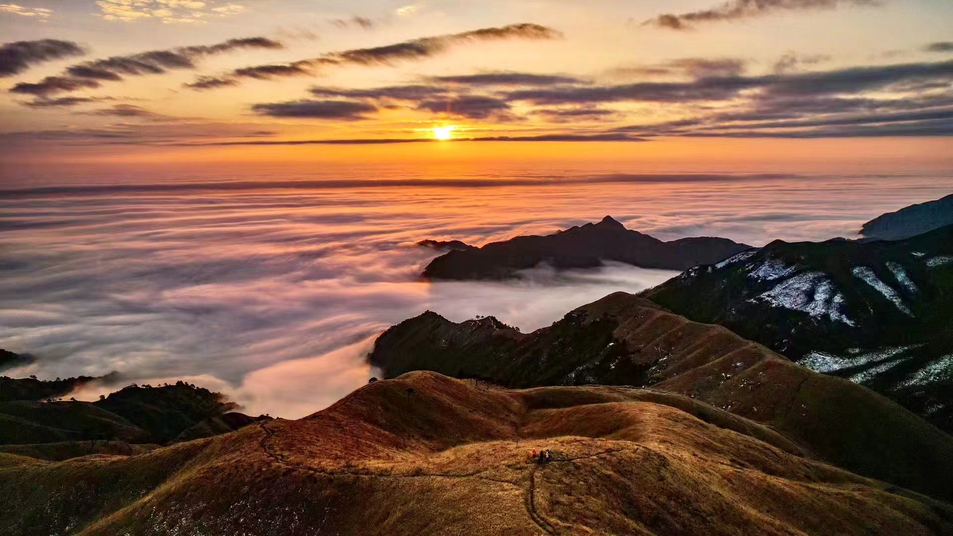 (大公文匯網 記者 王逍)1月5日是今年農曆小寒時節。素有「雲中草原 戶外天堂」的江西萍鄉武功山景區出現壯美的雲海日出景觀,雲霧時而奔騰跨山嶺而過,時而盤旋縈繞其間,景象壯美如畫,眾多遊客登高迎新,驚呼、讚嘆不絕。
