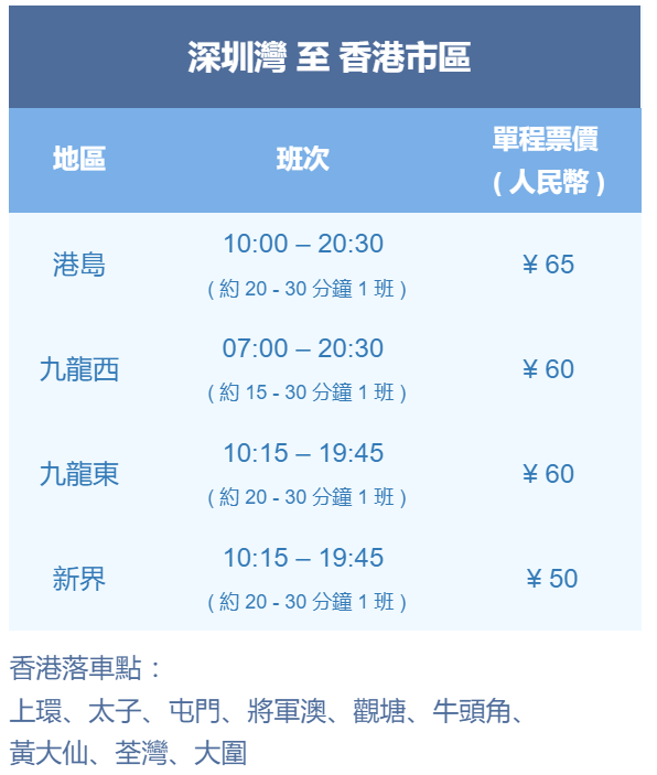 通關初期會提供往返市區至深圳灣口岸服務,預計每日班次不少於150班,香港發車站為上環、太子、將軍澳、觀塘、黃大仙、荃灣及大圍,服務會盡量覆蓋港九新界便利市民。