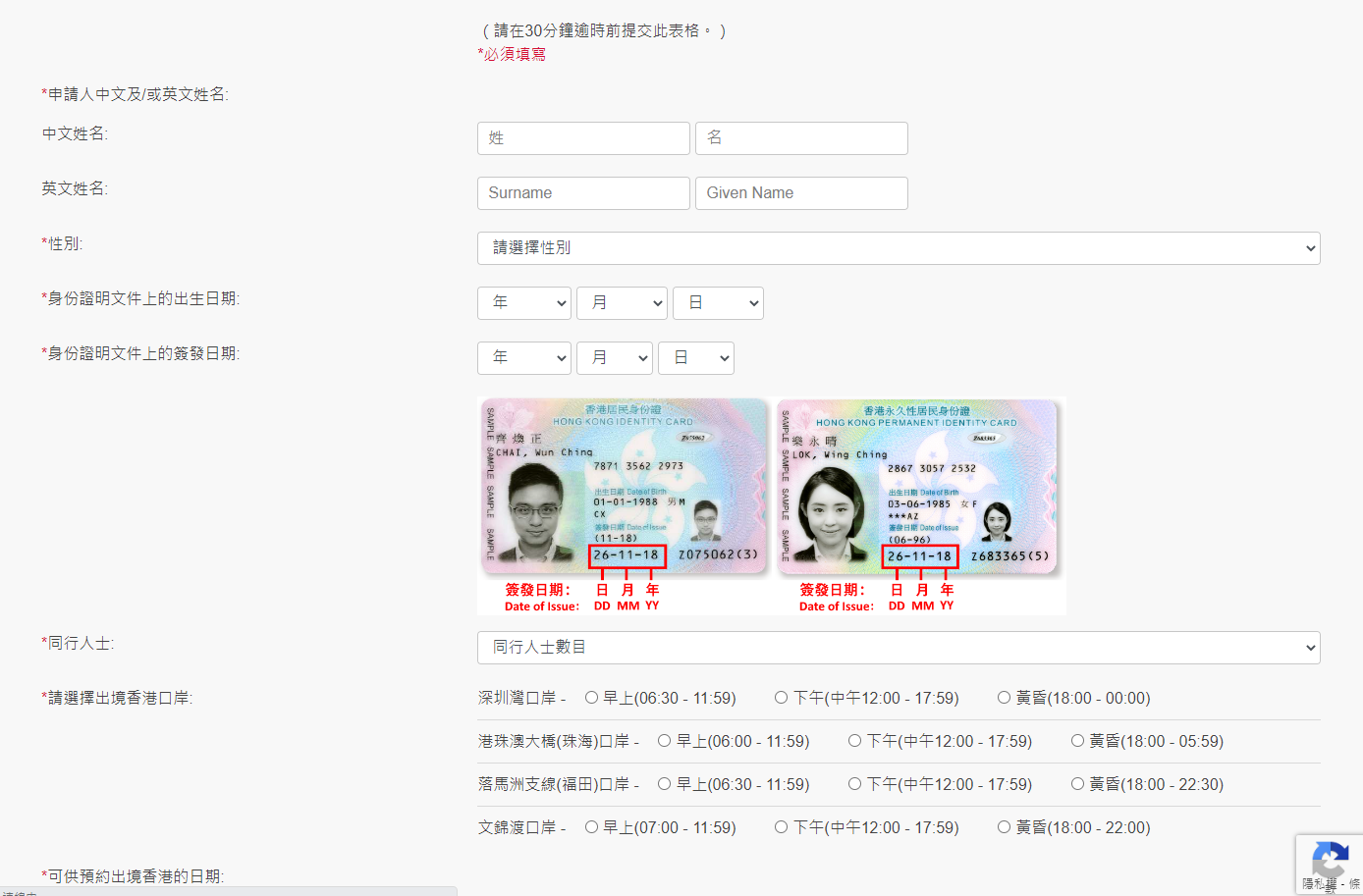市民需要提供身份證明文件,例如身份證、護照等,簡單填寫個人資料,包括:姓名、性別、身份證上的出生日期,持有身份證人士需要填寫身份證的簽發日期等,同時可以選擇填寫最多3名同行人士的資料,之後選擇出境口岸、日期及時段,還要提供可以接收短訊的電話號碼(內地、香港、澳門電話均可)。