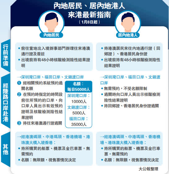 (大公報記者 石華、方俊明)5日,香港與內地首階段通關安排出爐。自1月8日起,包括深圳及港珠澳大橋在內多個口岸將開放供內地居民及居內地港人正常赴港。據深圳市口岸辦消息,深圳第一階段將恢復運行5個口岸,包括深圳灣、福田、文錦渡三個陸路口岸。經陸路口岸出境的內地居民需預約,每天開放名額共5萬個,居內地港人返港過關無需預約,而其餘的水路口岸、港珠澳大橋則通過售票調控過關人數,不設限額。1月6日上午9時,「深圳口岸發布」微信公眾號將開通陸路口岸赴港預約通道。