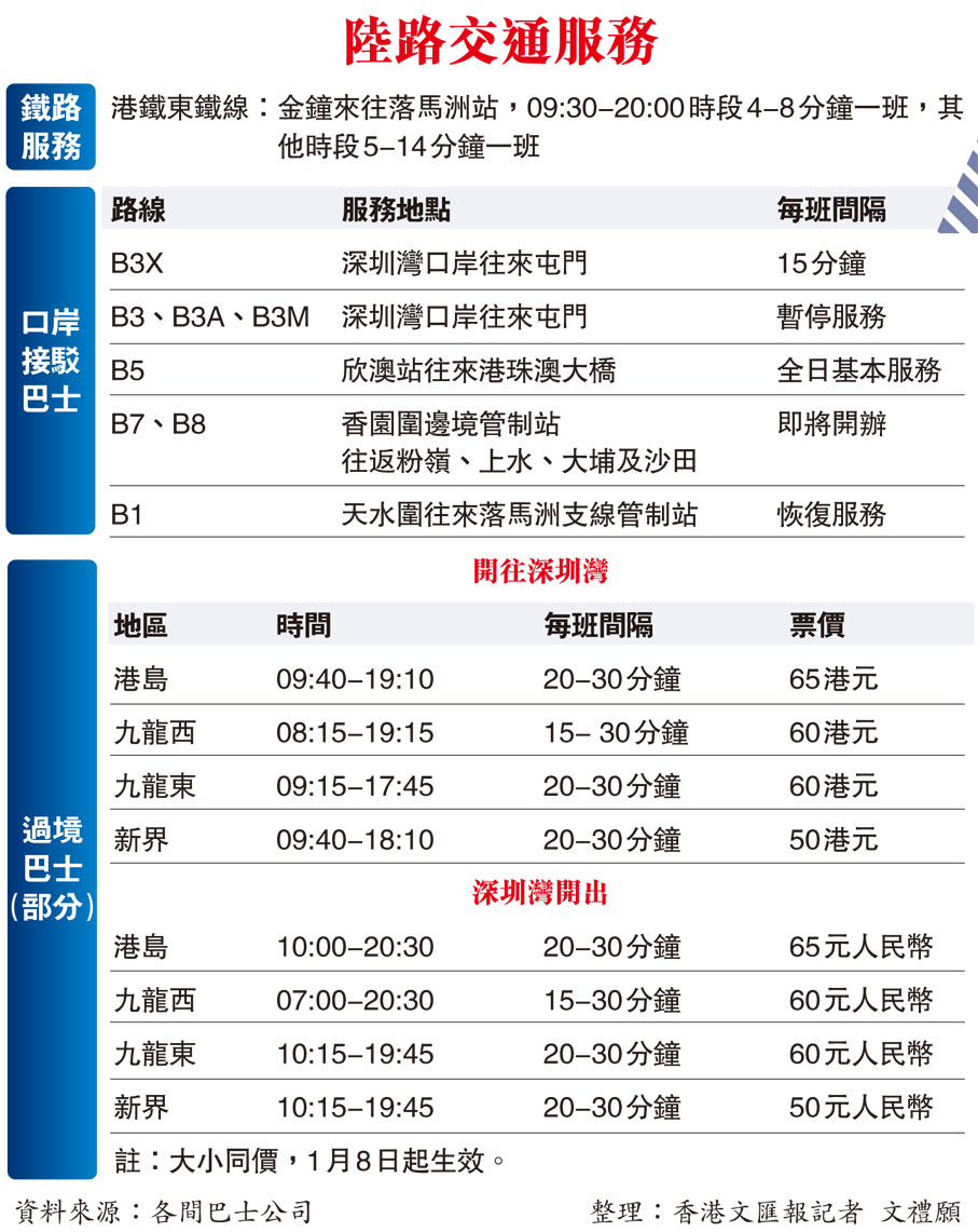 香港與內地復常通關進入首階段,海陸空交通蓄勢待發復運。港鐵宣布,1月8日起重開東鐵線來往金鐘及落馬洲站的列車服務,但羅湖站繼續關閉。城巴、九巴恢復或加強多條口岸路線服務。經營跨境巴士服務的冠忠巴士宣布,香港各區往深圳灣口岸的每日班次回復不少於150班,昨日開售車票。港澳船務也恢復。國泰航空亦由同日起往返內地城市的航班將增至每周對開61班,目標是3月底前增至對開100班。