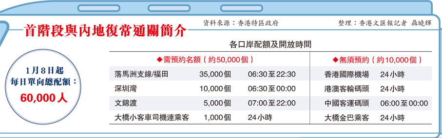 (香港文匯報記者 聶曉輝、文禮願、文森、唐文)期盼已久的香港與內地首階段復常通關細節終於出爐。國務院昨日發布優化內地與港澳人員往來措施,1月8日起港人可憑出發前48小時內的新冠核酸檢測陰性結果入境內地,入境時無須再接受核酸檢測及隔離檢疫。香港特區行政長官李家超其後在記者會上公布,首階段復常通關每日單向人數限制為6萬人,並會重開文錦渡、落馬洲支線及兩個海路口岸,合共7個口岸同時提供服務。除了海、空及港珠澳大橋外,其餘三個陸路口岸均需以先到先得方式預約指定口岸及時段的每日5萬個配額,預約系統昨晚6時起運作,並開放首八星期、每日5萬個配額供市民預約,截至昨晚11時,已有25萬人成功預約北上名額。不過,港人南下返港或內地人離境北上,均無須申請配額。首階段復常通關並未涵蓋的高鐵香港段,則不遲於1月15日恢復通車。
