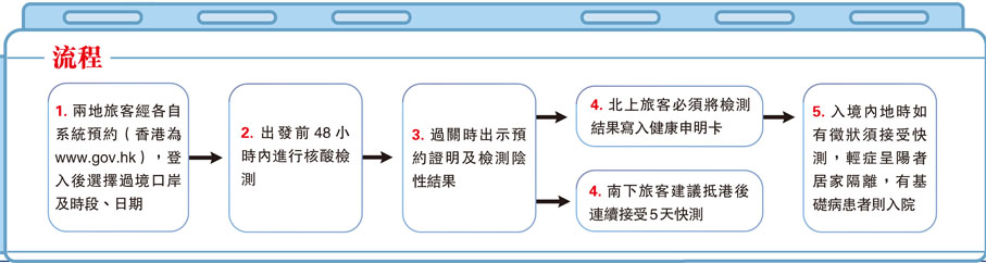 根據復常通關首階段安排,內地居民要先在深圳巿政府網上系統成功預約,同樣須出示48小時內有效的核酸檢測陰性結果才能入境香港,但抵港後無須再進行核酸檢測,特區政府建議他們抵港當天至第五天,每日自行快測和檢查自己身體狀況。