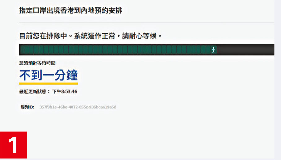 在香港特區政府昨日下午公布復常通關首階段的細節時,香港文匯報記者昨日下午5時50分起登入預約網站等候,等待頁面跳轉,可能是預約市民太多,網站運作並不流暢。系統最開始顯示等候時間為6分鐘至8分鐘,好不容易進入填寫資料的頁面時,卻經常出現頁面卡着、無反應,刷新過後被系統「踢出隊」,需要重新排隊,當時顯示的輪候時間延至55分鐘。記者手忙腳亂嘗試了約1小時,才成功搶到過關名額。政府資訊科技總監辦公室昨晚表示,網上預約系統於開放時曾處理大量市民同時進入,運作大致暢順,首兩小時已有超過15萬人預約入境內地。截至昨晚11時,超過25萬人完成預約。