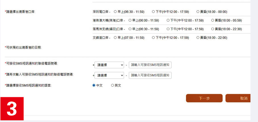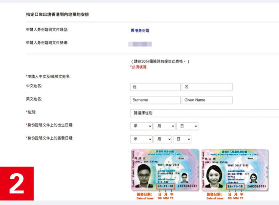 預約填表過程並不複雜:首先要填寫身份證號碼,然後限時30分鐘內補充詳細資料,包括身份證簽發日期、出生日期等,有4個出境口岸可供選擇,分別是深圳灣、港珠澳大橋、落馬洲及文錦渡口岸,開放時間各異,並設有不同時段(見截圖)。