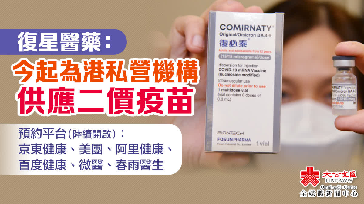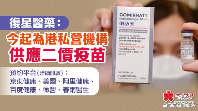 大公文匯全媒體報道,復星醫藥公布,自今日(6日)起,開始為香港的私營醫療體系供應「復必泰」二價疫苗,有需要人士可在提供「復必泰」二價疫苗的診所或醫療機構進行自費接種。