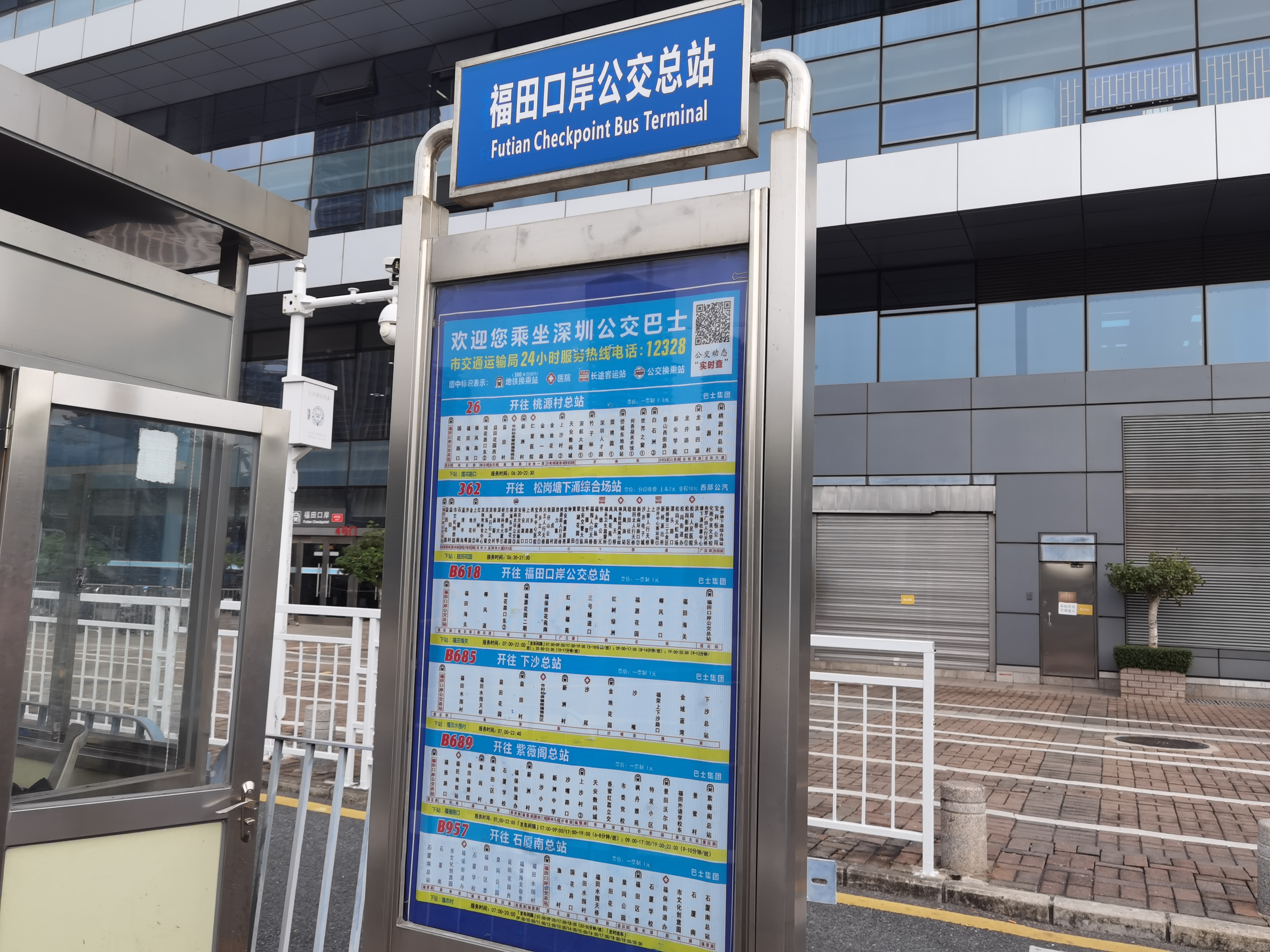 公交:旅客出聯檢大樓1號門後,沿裕亨路西行至福田口岸聯檢大樓西側,南行50m,過斑馬線到達福田口岸公交樞紐。