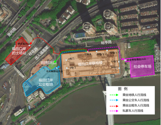 的士:旅客出聯檢大樓1號門後,沿裕亨路往西過2次斑馬線到達桂花路北側,沿桂花路繼續西行至福田口岸的士場站。
