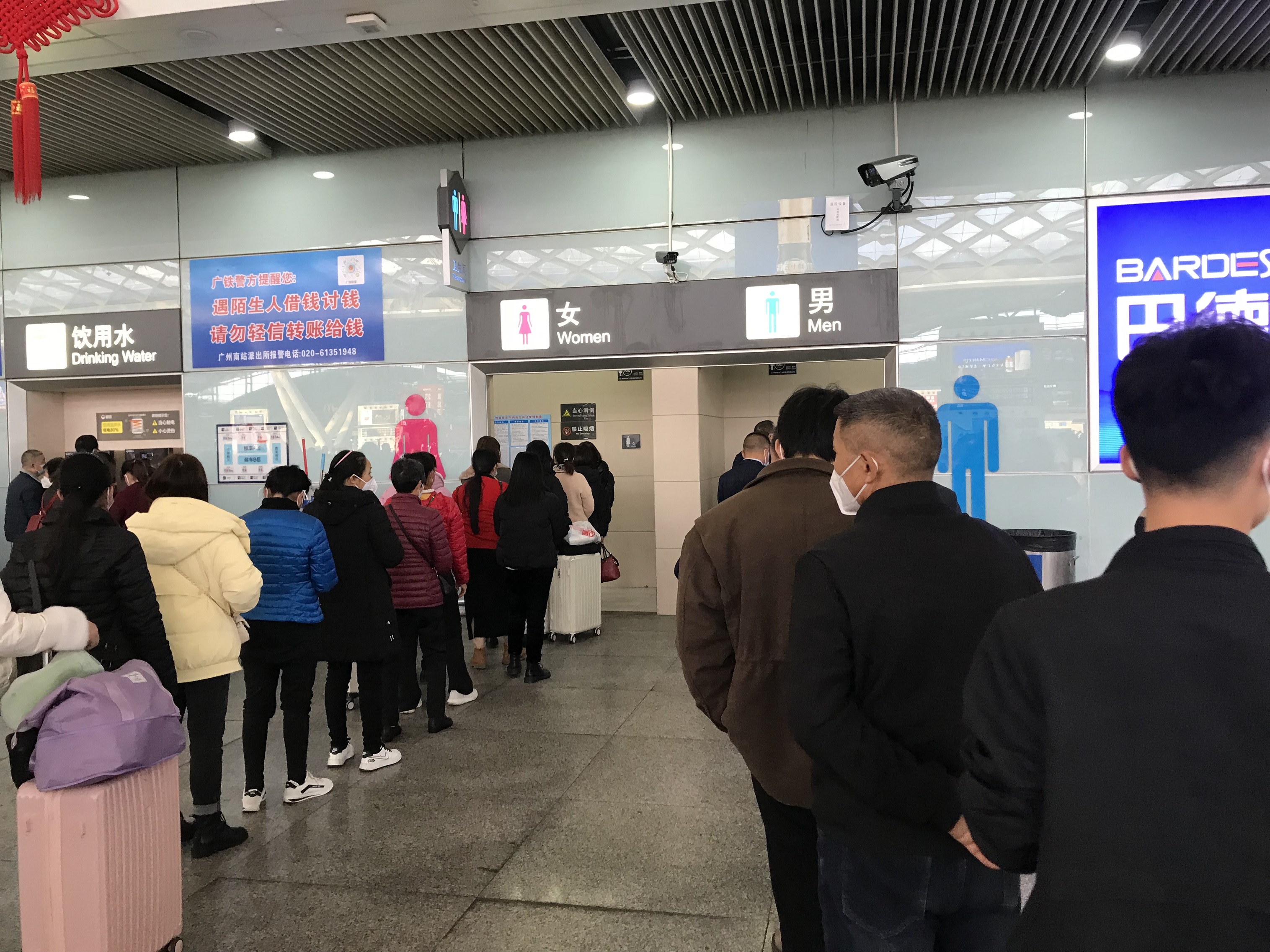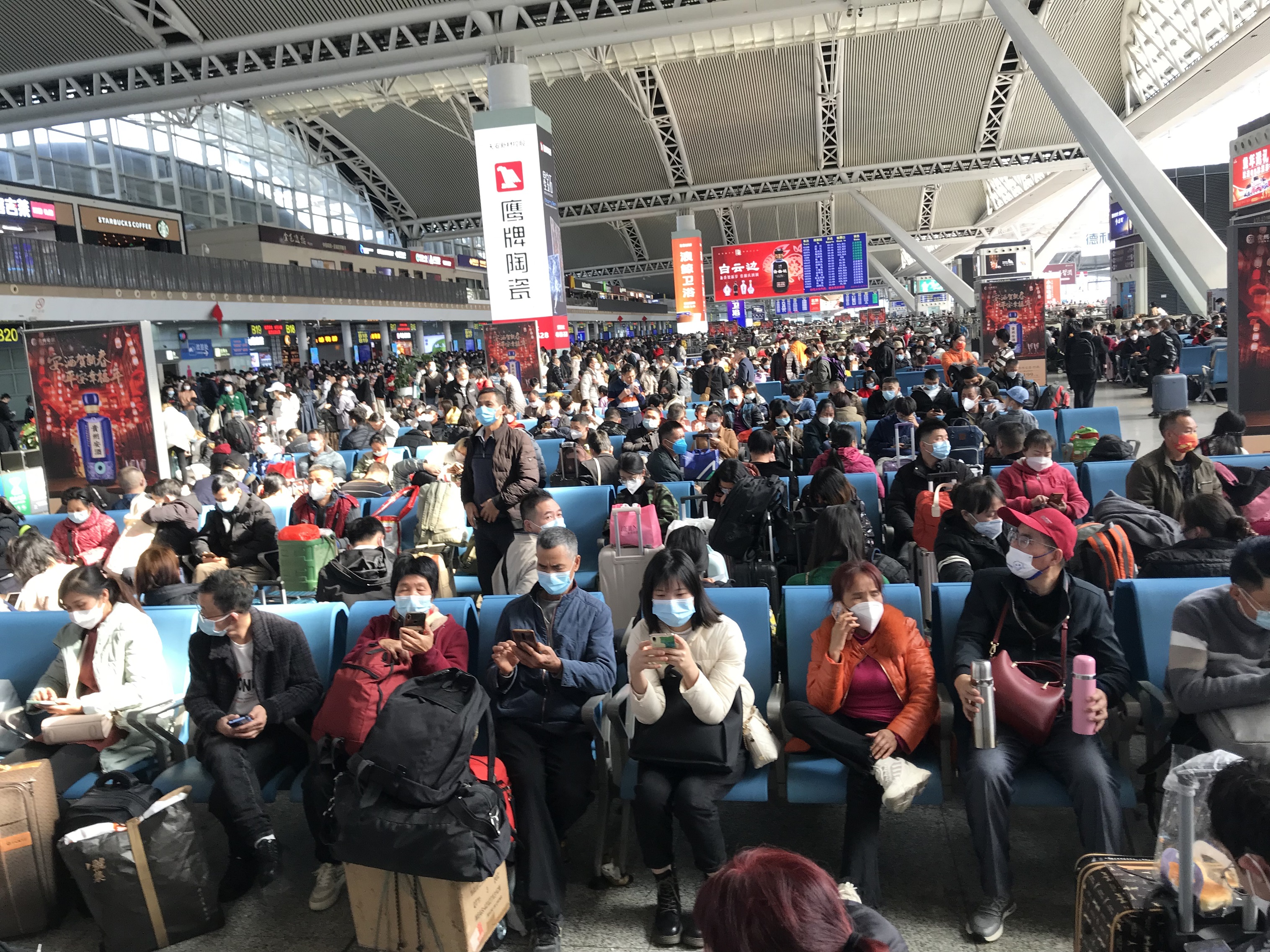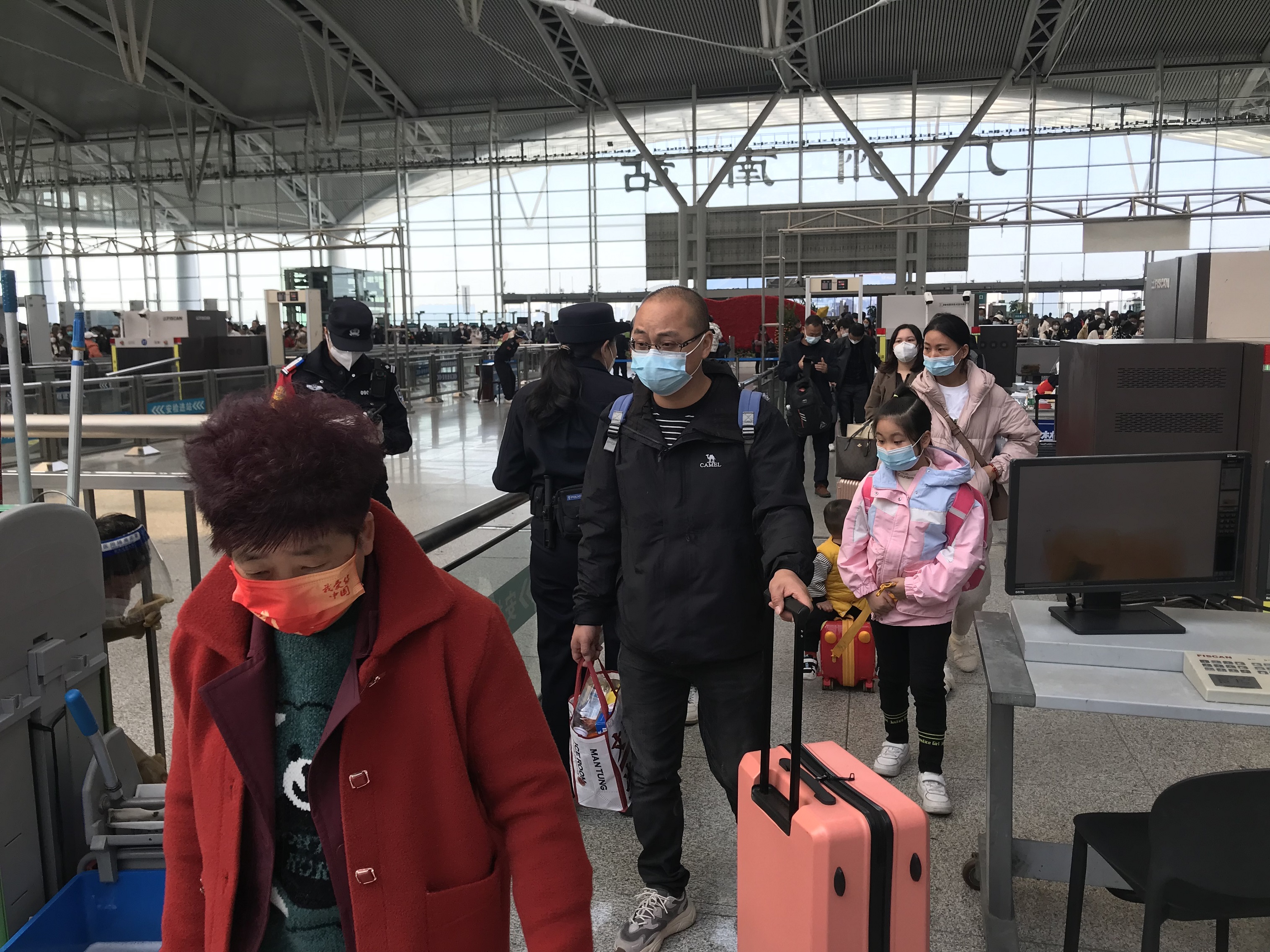 上午9時,廣州地鐵、公車站、的士等不同方向的旅客,密集湧向廣州南站。和過去三年春運不同,旅客無需測溫、亮健康碼和查驗核酸陰性證明,只需刷一次身份證、過一次安檢,就可以順暢地進入候車大廳。