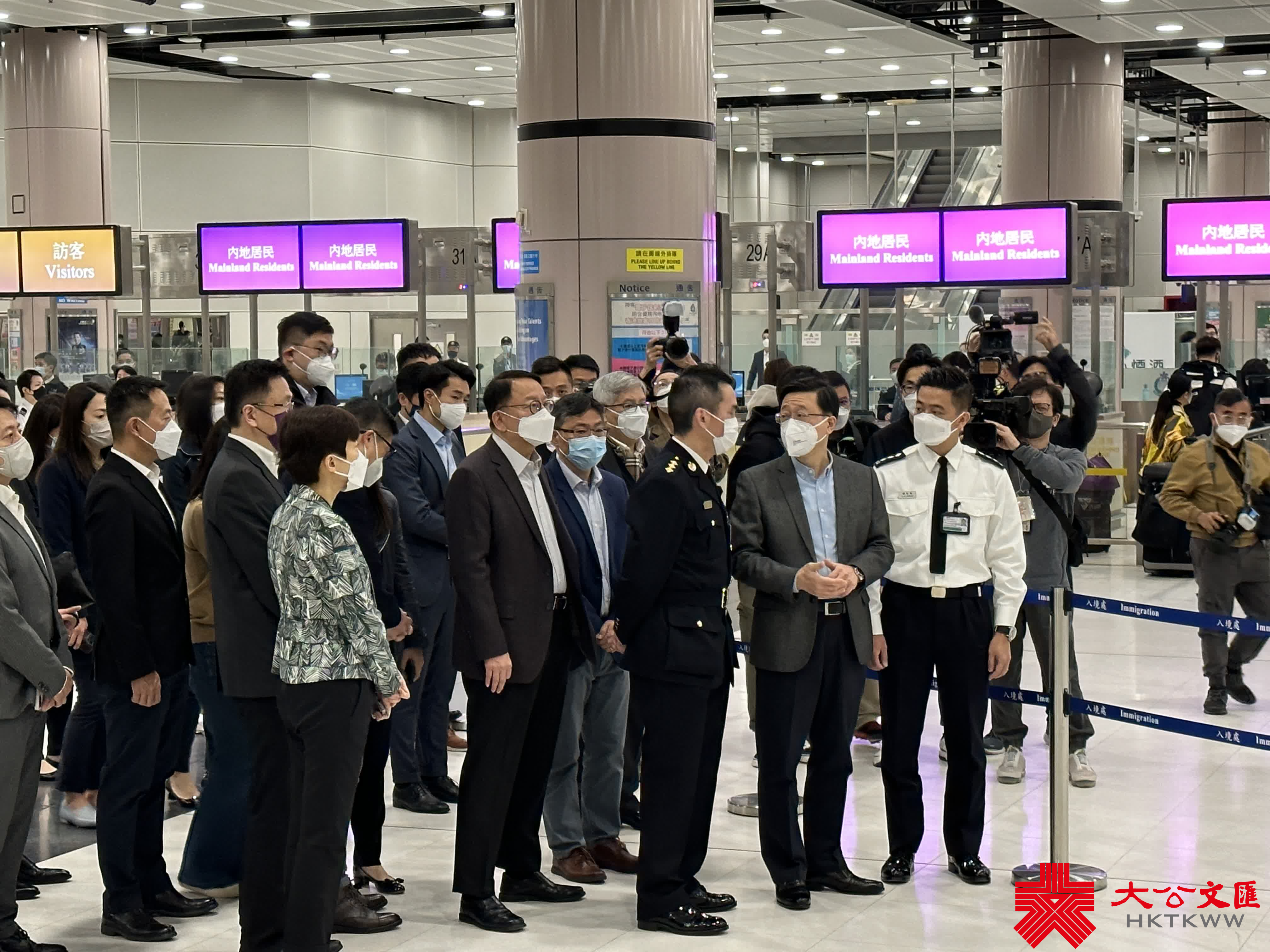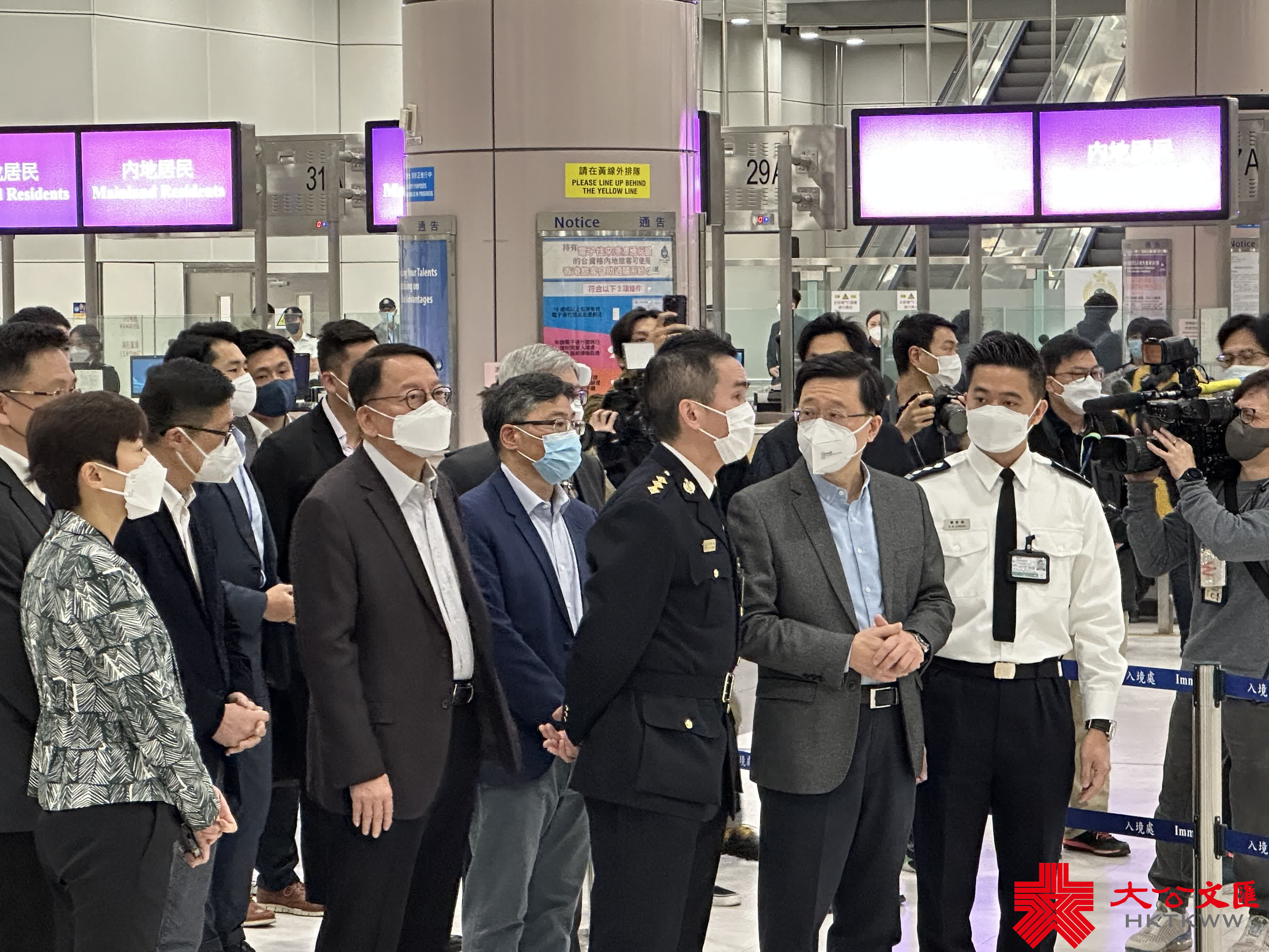 大公文匯全媒體報道,今日(8日)是香港與內地通關首日,行政長官李家超今早前往落馬洲支線管制站,視察運作情況,聽取現場人員介紹。同行的有政務司司長陳國基、保安局局長鄧炳強、創新科技及工業局局長孫東,以及海關關長何珮珊等。