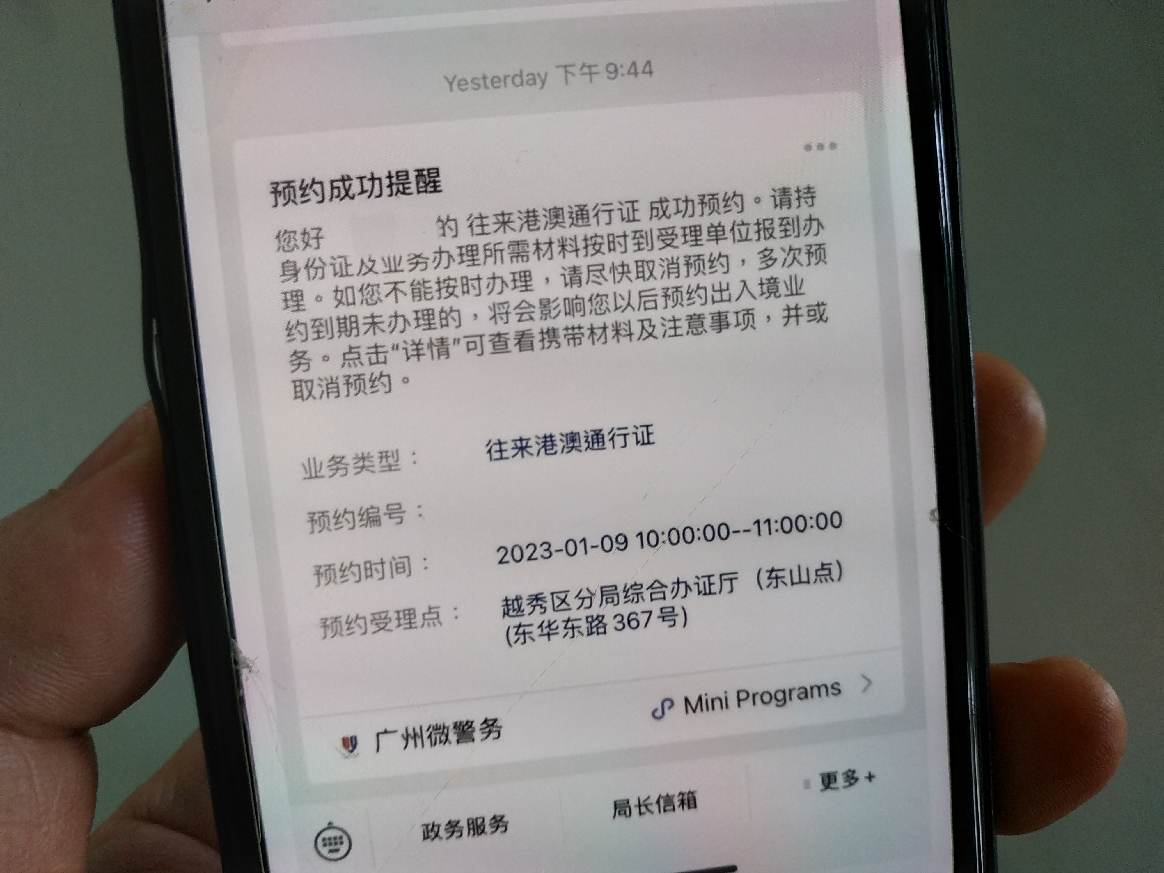 記者在「廣州公安」微信公眾號預約申請通道看到,赴港游簽注可選擇「三個月一次、三個月二次、一年一次、一年二次」4種簽注類型,赴澳游簽注可以選擇「三個月一次、一年一次」。廣州市民陳小姐成為「飲頭啖湯」首批市民之一,她已順利預約了9日早上十時可到出入境辦證中心辦理赴港、赴澳簽注。「今次港澳我都選了『三個月一次』的簽注,希望春節期間可以來個『港澳聯游』體驗新春氣息」。