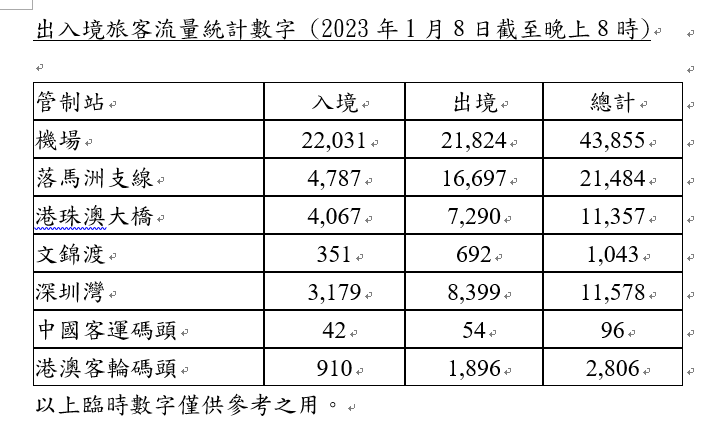 出境居民中,21824人次經機場出境,16697人次經落馬洲支線(福田)口岸出境,8399人次經深圳灣口岸出境,7290人次經港珠澳大橋口岸出境。另有1896人次經港澳碼頭出境,692人次經文錦渡口岸出境,54人次經中國客運碼頭出境。詳情如下圖: