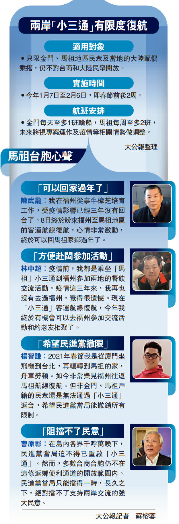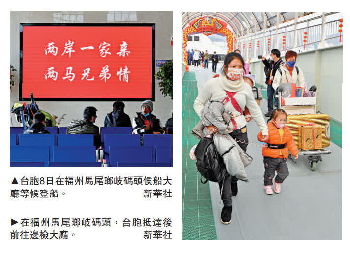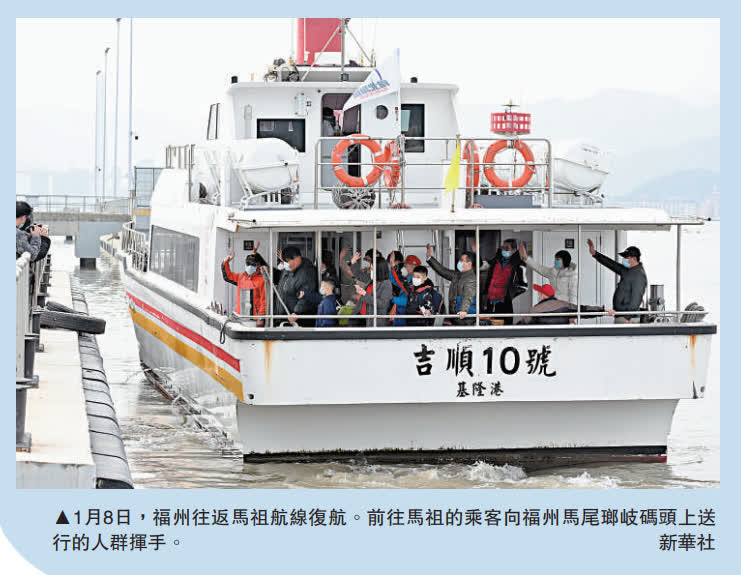 (大公報 記者 蘇榕蓉 福州報道)繼1月7日起「廈金小三通」復航後,8日起福州至馬祖的「兩馬小三通」海上航線也恢復。至此,中斷了近3年的兩岸「小三通」客運航線已逐步部分復航。台胞向大公報表示,因為民進黨當局設限,導致福州到馬祖的一個半小時航程「走」了三年,至今才恢復,孩子很久沒有見到爺爺和奶奶了,歸心似箭。然而,不僅金馬地區民眾有探親需求,在大陸的其他台灣民眾也要返台探親,島內輿論期盼民進黨當局拋開「反中仇中」的意識形態,盡早全面恢復「小三通」,為民眾提供返鄉過年的便利。