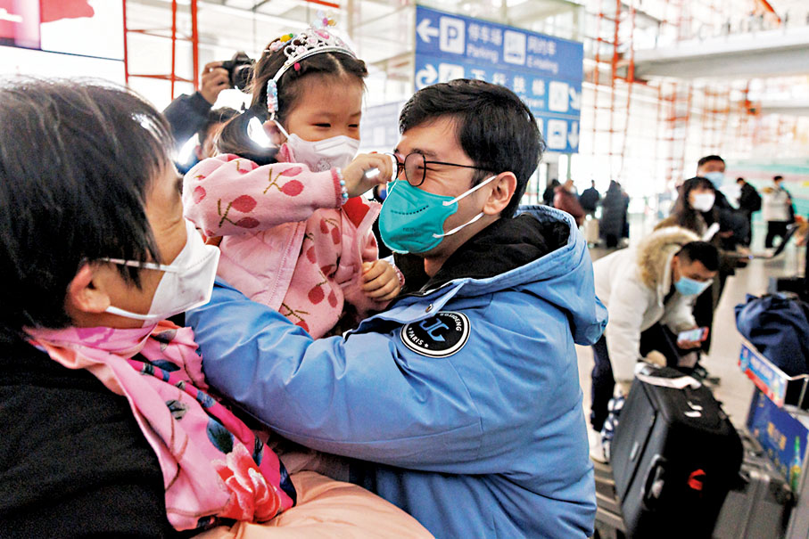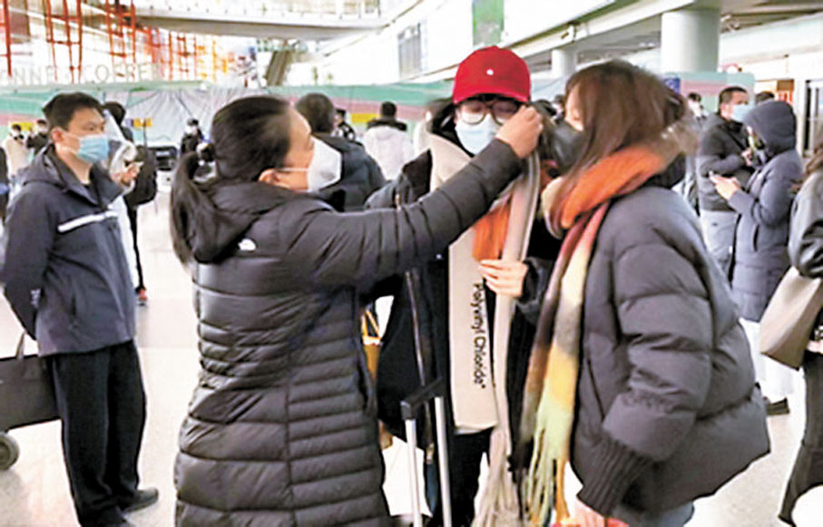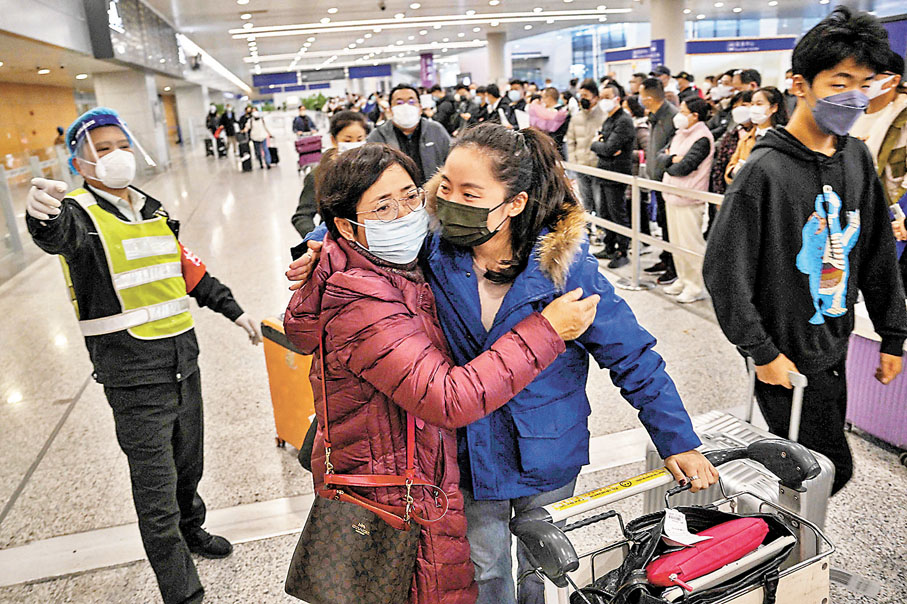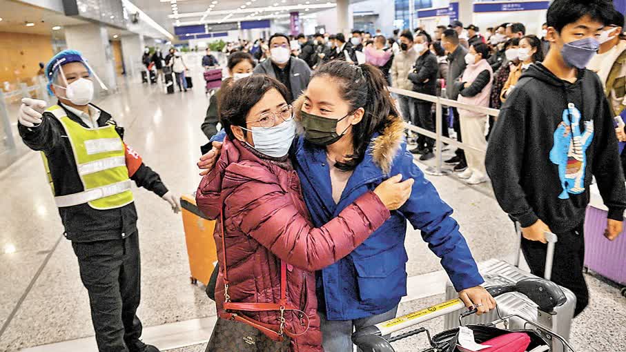 在北京首都國際機場,昨日從香港轉機抵達的不少回國者表示,能與親友團聚過春節很開心,相信這一波疫情很快會過去,未來會愈來愈好。一名留學生白女士剛見到母親和妹妹,就激動地抱在一起,「能見到你們,真是太太開心了。」母親還細心幫她整理衣領。她說自己在美國紐約大學求學3年,一直非常想念家人,但以前入境隔離期太長,現在終於等到政策放開,便迫不及待買機票回國,今年春節全家人一定要好好團聚。