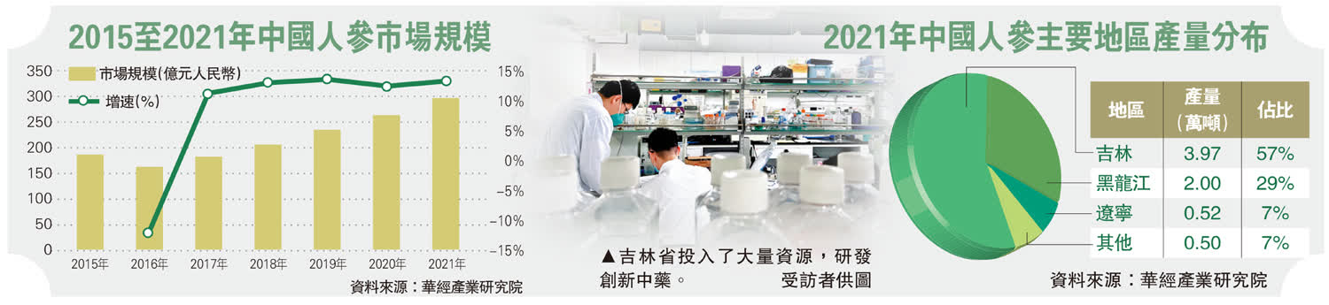 目前吉林省已開發生產人參食品、藥品、保健品、化妝品、生物製品五大系列1000多種產品。得益於精深加工能力的提高,2015年到2021年,人參產業綜合產值增長30.3%,達到600億元。