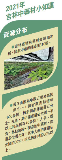 吉林省地處長白山腹地,野生植物達823屬3900多種。人參、五味子等10種道地中藥材產量居全國之首。長白山作為「北藥」的基地,吉林農業大學中藥材學院博士生導師楊利民認為,吉林省中藥資源豐富,正朝着中藥產業強省邁進,但也存在中藥材產業發展的不平衡等問題。在大力發展中藥產業過程中,應特別注意西部草原區的特色中藥資源開發在農業產業結構調整中的重要作用。