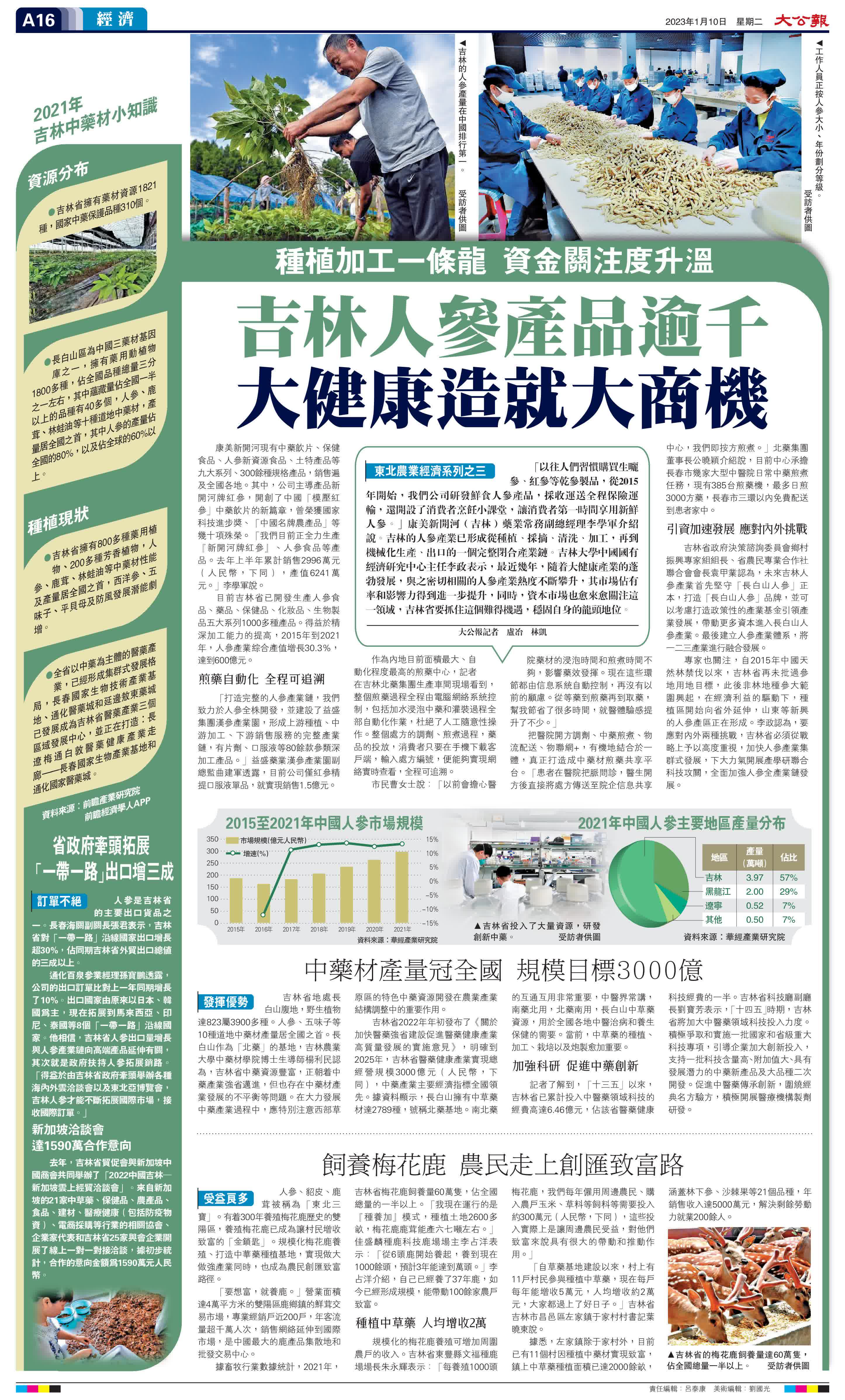 (大公報記者 盧冶 林凱)「以往人們習慣購買生曬參、紅參等乾參製品,從2015年開始,我們公司研發鮮食人參產品,採收運送全程保險運輸,還開設了消費者烹飪小課堂,讓消費者第一時間享用新鮮人參。」康美新開河(吉林)藥業常務副總經理李學軍介紹說。吉林的人參產業已形成從種植、採摘、清洗、加工,再到機械化生產、出口的一個完整閉合產業鏈。吉林大學中國國有經濟研究中心主任李政表示,最近幾年,隨着大健康產業的蓬勃發展,與之密切相關的人參產業熱度不斷攀升,其市場佔有率和影響力得到進一步提升,同時,資本市場也愈來愈關注這一領域,吉林省要抓住這個難得機遇,穩固自身的龍頭地位。
