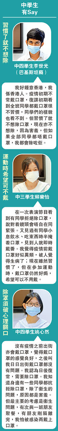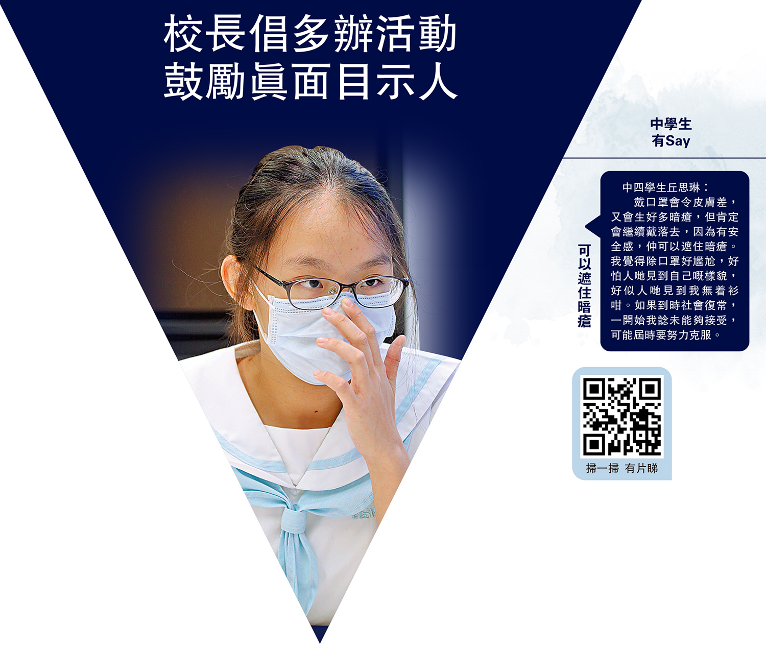 有中學校長直言,近期察覺部分學生有拒絕除口罩的心態,有如在炎夏堅持穿長袖冷衫一樣,均屬欠缺自信的表現。面對逐步復常,學校應多舉辦集體活動,因為總有一天要重新過新生活。