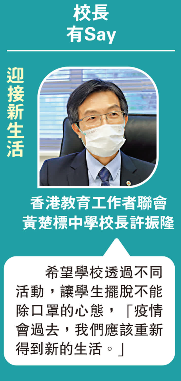 疫情漸趨平穩,社會步向復常,許振隆指該校近期亦透過參加公開比賽及活動,例如在許可的情況下,於視頻及攝錄活動中會鼓勵學生不用戴口罩,讓表演更自然,當中包括今年喜迎二十大的活動中,該校參與朗誦《中華頌》,眾學生均除下口罩表演,展現自信一面。他希望學校都可透過不同活動,讓學生身心發展覺得有成就感,就會擺脫靠戴口罩隱藏感情及其不足,「疫情會過去,我們應該重新得到新的生活。」