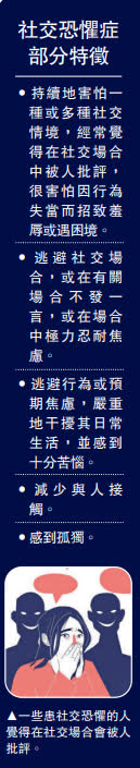 社交恐懼症令病人無法有正常的社交活動,影響生活、工作或學業,病人也會感到氣餒和沮喪,因而更加逃避。相關症狀可以透過心理治療及藥物醫治,只要及早尋找正確的治療,治癒率一般都很高,讓病人可以重過正常的社交生活。