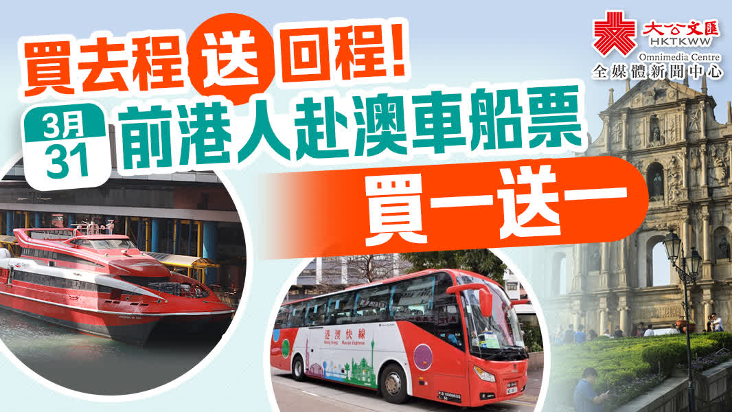 大公文匯全媒體報道,澳門旅遊局今日(10日)宣布,將於1月13日至3月31日向香港居民推出港澳穿梭巴士車票或船票「買去程送回程」的買一送一優惠,回程不可與去程同日,鼓勵旅客在澳過夜住宿,增加留澳時間。