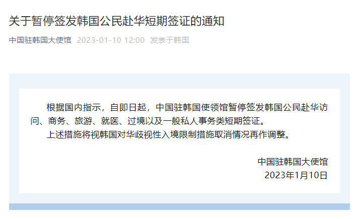 1月10日,中國駐韓國大使館發布關於暫停簽發韓國公民赴華短期簽證的通知。詳情如下: