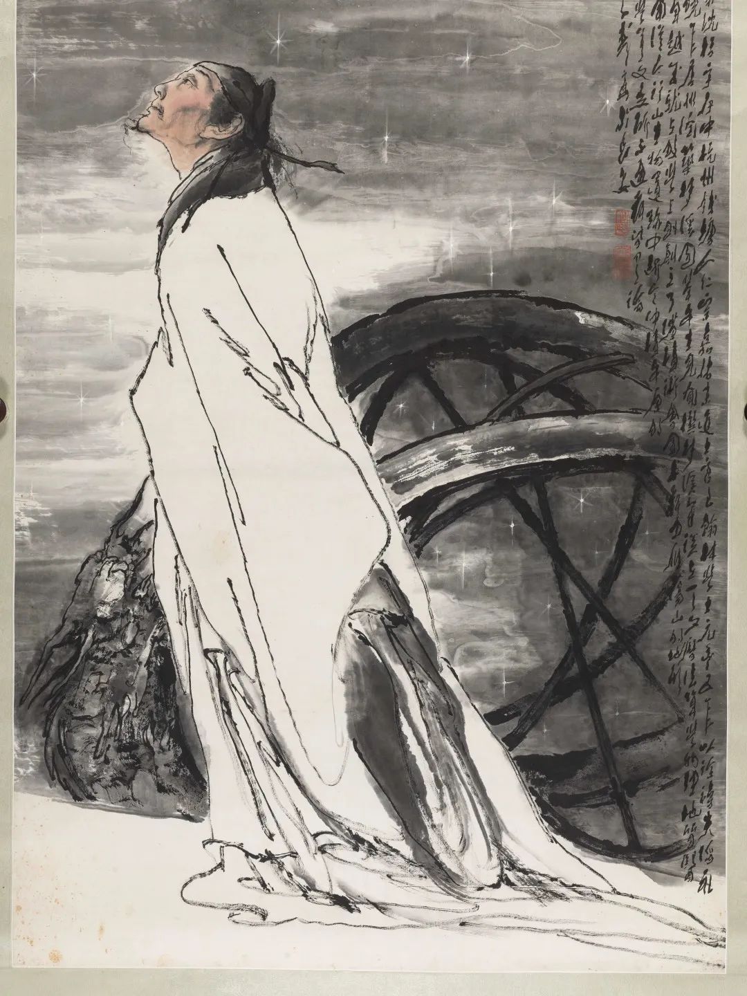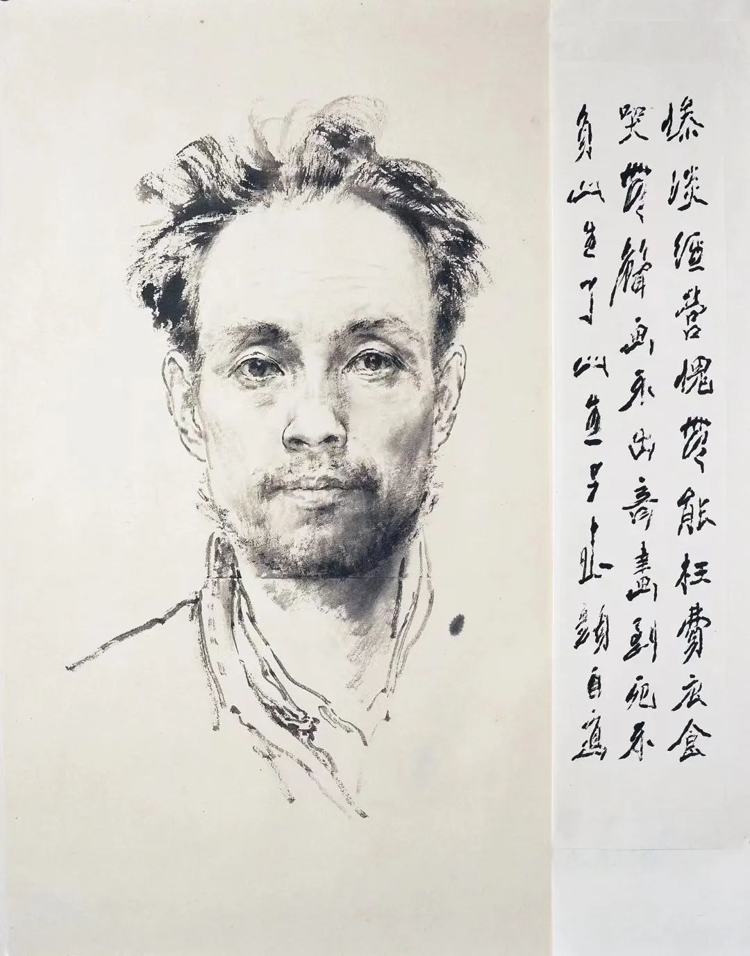 此次展出的父親的人物畫依然十分搶眼,比如《白石老人》《子武自畫像題詩》《小燕畫像》《彞族少女》《關中老人》《沈括夜觀》等,畫麵線條流暢,受到專家廣泛讚譽。他的自畫像《子武自畫像題詩》作於1976年,題《子武卌自寫》詩:「慘淡經營愧無能,枉費衣食哭無聲。畫不出奇畫到死,不負此生了此生。」那是他人生和藝術創作最為艱難的時刻,當時生存環境惡劣,可謂窮困潦倒,又得了嚴重肺病,幾乎不治。他最終戰勝病魔,重振藝術雄風,十分感人。