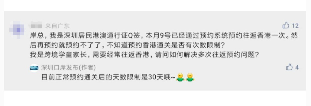 有市民早前在網上發帖表示,「過深圳關的時候工作人員告訴我,目前去香港一個月只能預約一次」。還有市民曬出深圳口岸辦公眾號回覆:「正常預約通關後的天數限制是30天」,但是該貼已經刪除。