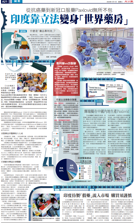 大公報綜合路透社、彭博社報道:美國藥企輝瑞的新冠口服藥Paxlovid近期在中國內地被瘋狂炒賣,導致一藥難求,有不少人轉而購買印度生產的Paxlovid仿製藥,「綠盒」Primovir以及「藍盒」Paxista仿製藥十分暢銷。多年來,以仿製藥聞名的「世界藥房」印度,印度政府從政策扶持、完善法律、貿易談判等多方面支持本國製藥業發展,其生產的仿製藥供應量份額佔全球的20%,銷往200多個國家和地區。