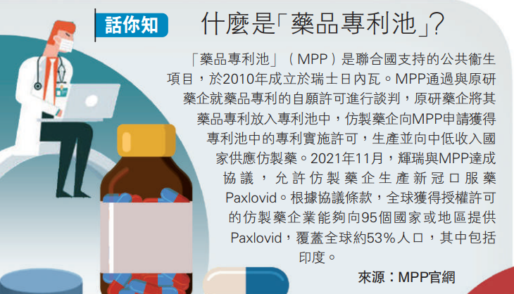 輝瑞研發的新冠藥物Paxlovid,於2021年12月22日獲美國食品及藥品監督管理局(FDA)緊急使用授權,用於治療12歲及以上、有較高風險出現重症的新冠患者,成為美國首個獲批的新冠口服物。根據輝瑞與聯合國支持的公共衞生項目「藥品專利池」(MPP)達成的協議,包括印度在內的95個國家及地區獲授權仿製Paxlovid。