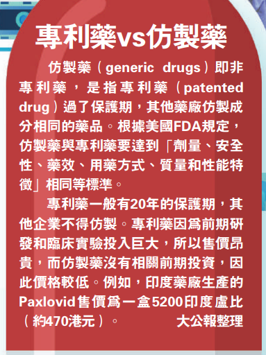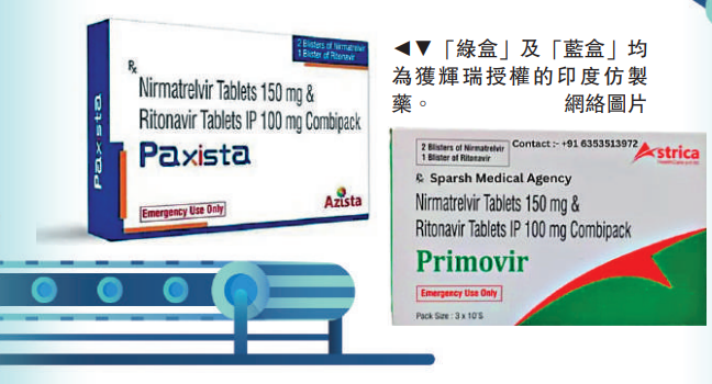 根據輝瑞與印度達成的協議,印度多家藥廠獲授權生產Paxlovid,須先完成本地的臨床測試。印度製藥商Hetero生產的Paxlovid口服藥於去年年底推出(「藍盒」Paxista為其子公司生產),售價約為一盒5000印度盧比(約470港元)。相較於美歐逾500美元一盒的原廠採購價,印度仿製藥價格不足其1/9。