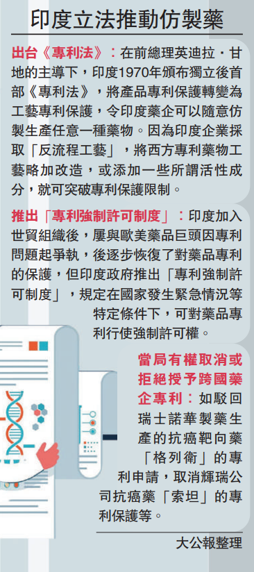 在前總理英迪拉·甘地的主導下,印度1970年頒布獨立後首部《專利法》,將產品專利保護轉變為工藝專利保護,令印度藥企可以隨意仿製生產任意一種藥物。因為印度企業採取「反流程工藝」,只需將西方專利藥物工藝略加改造,或添加一些所謂活性成分,就可突破專利保護限制。