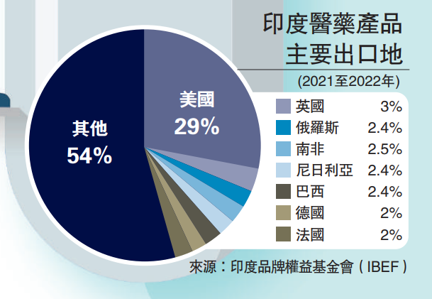 印度製藥業主要分為原料藥、醫藥外包、製劑出口及仿製藥,近三分之二的藥品出口集中在北美、歐洲和非洲。根據印度商務部下設的印度品牌權益基金會(IBEF)發布的最新報告,2021至2022年,印度製藥業的前五大出口目的地分別為美國、英國、南非、俄羅斯和尼日利亞。