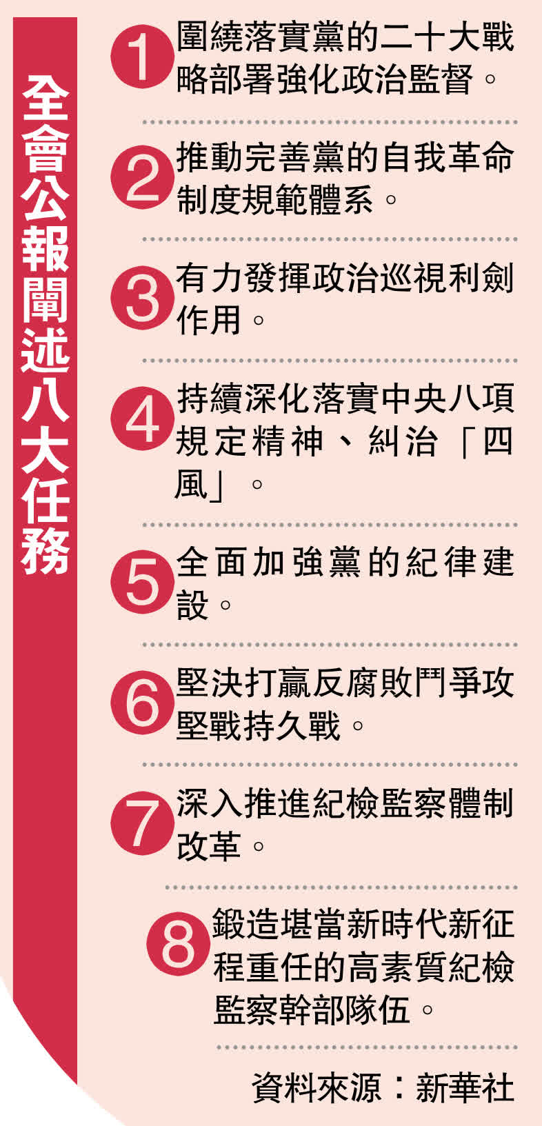 全會公報闡述八大任務,其中第四項任務指出,持續深化落實中央八項規定精神、糾治「四風」。嚴肅整治損害黨的形象、群眾反映強烈的享樂主義、奢靡之風,對頂風違紀行為露頭就打、從嚴查處,堅決防反彈回潮、防隱形變異、防疲勞厭戰。緊盯反覆性頑固性、改頭換面、隱蔽隱性問題,加大查處問責力度,堅決破除特權思想和特權行為。重點糾治形式主義、官僚主義,緊盯貫徹黨中央重大決策部署不擔當、不用力,對政策舉措和工作部署片面理解、機械執行、野蠻操作,玩忽職守不作為,任性用權亂作為,權力觀異化、政績觀扭曲、事業觀偏差等問題,深挖根源、找準癥結,精準糾治、增強實效。