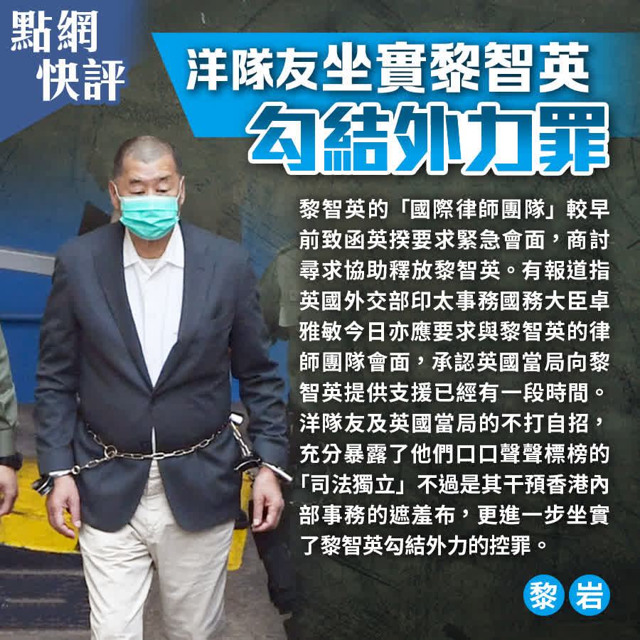 黎智英的「國際律師團隊」較早前致函英揆要求緊急會面,商討尋求協助釋放黎智英。有報道指英國外交部印太事務國務大臣卓雅敏今日亦應要求與黎智英的律師團隊會面,承認英國當局向黎智英提供支援已經有一段時間。洋隊友及英國當局的不打自招,除暴露他們口口聲聲標榜的司法獨立不過是其干預香港內部事務的遮羞布外,更進一步坐實了黎智英勾結外力的控罪。