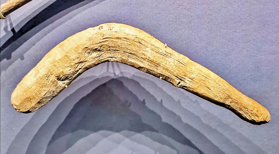飛去來器是西域先民用來投擲狩獵的工具,在新疆鄯善、哈密等地的墓葬均有出土。本次展出了新疆哈密市五堡墓地出土的距今約3000年的飛去來器,由自然彎曲的木頭製成,上部呈半圓形,夾角較大,長端45厘米,柄部作橢圓狀,也是先秦時期珍貴文物遺存之一。天山以南地區,木器生產是一個重要行業,其傳統製作方法是用刀進行掏、刮、削。而此次展出的從新疆和田地區洛浦縣山普拉墓葬出土的漢晉時期的木碗,則是用迴旋切削法製成的木器。器物呈圓形,整體規整光滑,素面,斂口,弧腹,假圈足。口沿處稍有殘缺,透出了幾分古樸。這件珍貴實物也說明在漢代,和田地區已經有了旋木工藝和精於木工的匠人,開始用簡單的機械來加工生活用品。