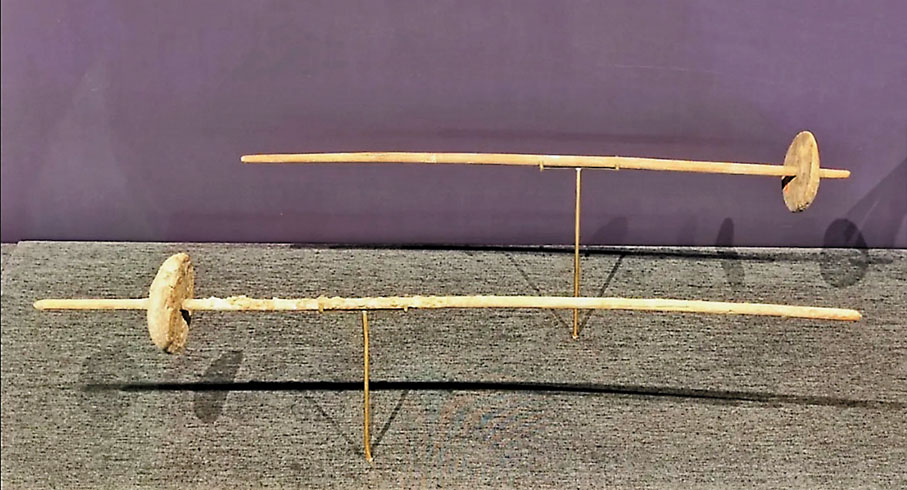 本次展出的木製品中,新疆巴音郭楞蒙古自治州且末縣扎滾魯克墓葬出土的刻花木紡錘,尤為引人矚目。作為我國最早用於紡紗的工具,紡錘由紡輪和錘桿兩部分組成。紡輪多以陶質和石質材料製成,在我國多地墓葬中均有發現,但錘桿為木質,不易保存,只有新疆獨特「天時地氣」讓今天的人們可以看到距今約3000-2200年的完整的木紡錘實物遺存。