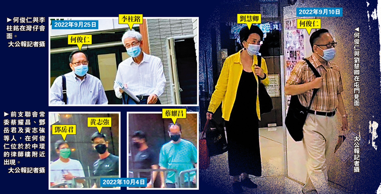 即使何俊仁於2016年10月不再出任立法會議員身份,他仍與黎智英頻密會面。2019年12月13日,李柱銘、李卓人、林卓廷、何俊仁及李永達到黎智英寓所密會。2020年2月28日,黎智英被捕獲釋之後,該晚隨即召集同樣被捕的李卓人以及何俊仁、李永達三人在西環一家餐廳聚餐。同年8月,黎智英因為涉嫌國安法被捕,獲釋後即召來何俊仁、李永達、林卓廷及胡志偉等到其寓所密會兩個小時,再密謀搞局。2020年12月,何俊仁還為黎智英支付了10萬港元的人事擔保。