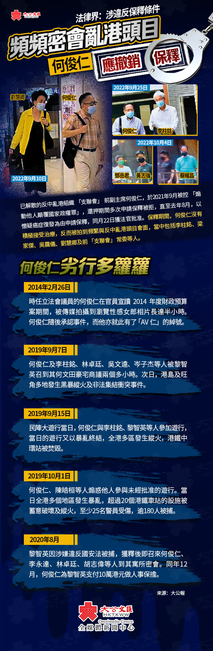 有政界、法律界人士表示,何俊仁保釋期間多次不避嫌、明目張膽地接觸反中亂港分子,是有心挑戰法律,很可能違反了保釋條件,促請執法部門關注,撤銷其保釋,立即收押。