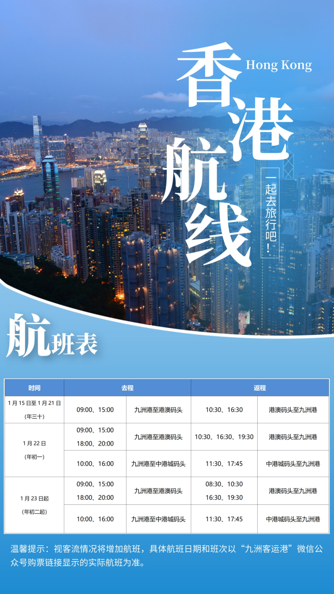 從1月23日起,九洲港至港澳碼頭往返的航班增至每天8個班次,九洲港往返至中港城碼頭的4個航班。