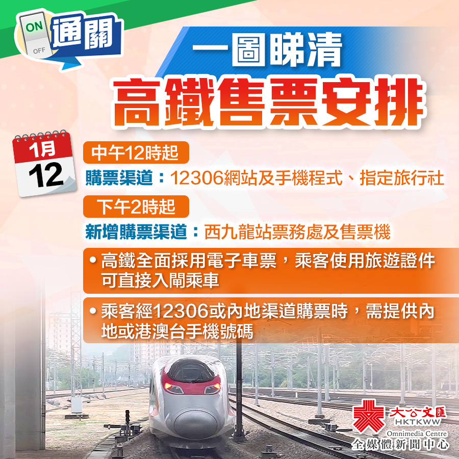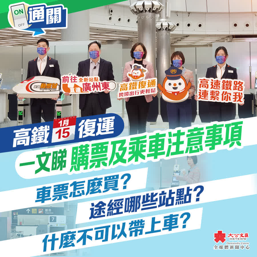 高鐵香港段本周日(15日)復運,途經福田、深圳北、廣州南、廣州東站,初期每日出售上限1萬張車票,北上及南下上限各5000張。今日(12日)中午12時起,市民可透過12306帳戶及手機程式、或前往指定旅遊社買飛,西九龍站票務處及售票機亦會於下午2時重開,供市民前往購票。大公文匯全媒體整理了高鐵購票、乘車等注意事項,助你旅程更順利!