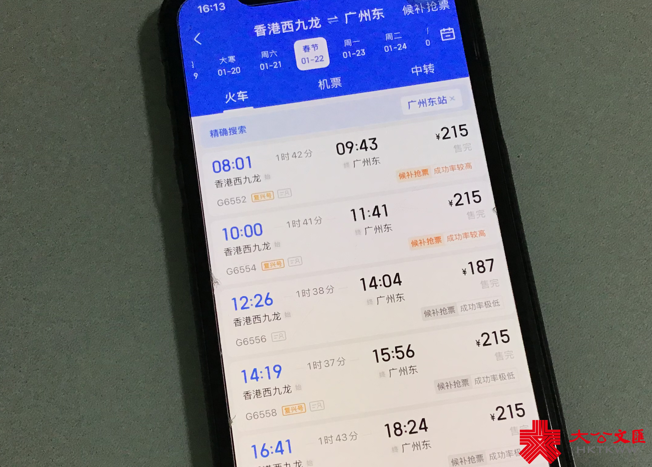 (大公文匯網 記者 方俊明)香港高鐵1月15日起首度通往廣州東站,今日(12日)12時起進行預售。記者於今日16時登陸中國鐵路12306官網看到,從香港西九龍開往廣州東的高鐵票預訂火爆,春節(1月22日)當天及春節之前的所有車次均已全部售完。